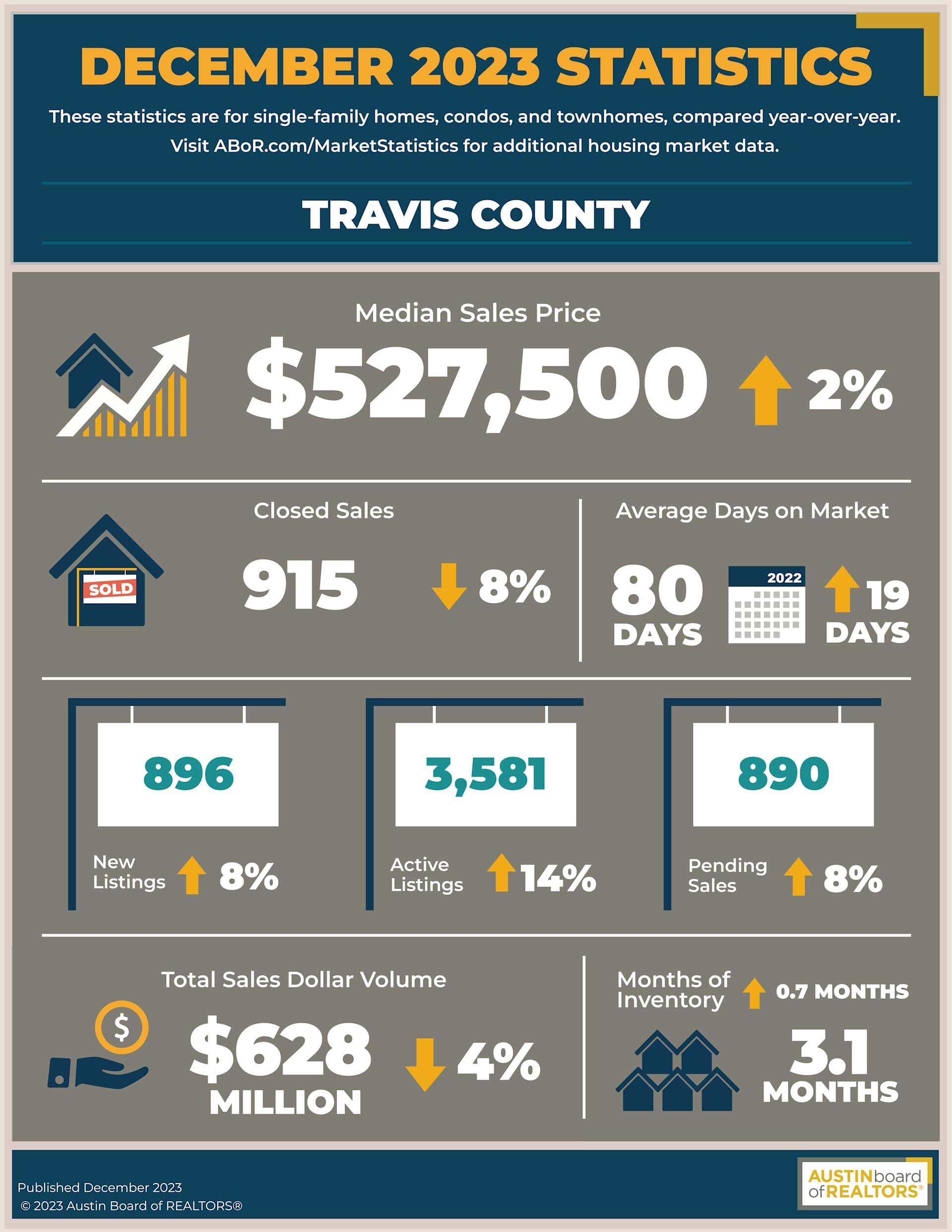 The median home price in Austin saw a modest increase of 2%, reaching $527,000 in December 2023. This uptick suggests sustained demand in the market, driven by factors such as population growth, job opportunities, and a favorable quality of life.